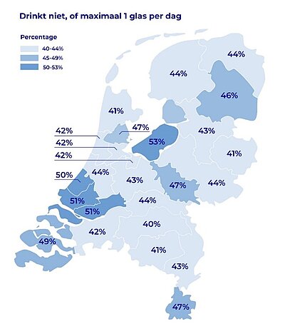 Het aandeel Limburgers dat overmatig drinkt, daalde van 8% in 2012 naar 5% in 2024. Overmatig drinken betekent dat een vrouw minstens 14 glazen of een man minstens 21 glazen alcohol per week drinkt. Ook houden steeds meer mensen zich aan het alcoholadvies van de Gezondheidsraad: geen alcohol of in elk geval niet meer dan één glas per dag. Dit aandeel steeg de afgelopen twaalf jaar van 38% naar 45%.