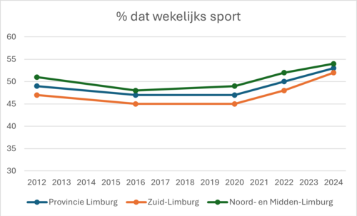 Ook het beweeggedrag is de laatste jaren veranderd. Steeds meer mensen doen aan sport. Inmiddels sport 54% van de Limburgse volwassenen minstens één keer per week. Toch voldoet nog minder dan de helft (44%) aan de beweegrichtlijn. Die adviseert om wekelijks minstens 2,5 uur matig intensief te bewegen, zoals stevig wandelen of fietsen. Het doel van de overheid is dat in 2040 ten minste 75% van de Nederlanders aan deze richtlijn voldoet.